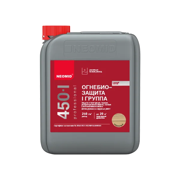 Неомид 450 является средством для огнебиозащиты древесины, предназначено для работ внутри и снаружи помещений. Оно переводит древесину в трудновоспламеняемый и трудногорючий материал и обеспечивает I группу огнезащитной эффективности. Этот продукт защищает древесину от гниения и образования плесени, а также от биологических поражений. Он предназначен для использования на деревянных конструкциях и изделиях, таких как стены, балки, строительные системы, несущие брусья, перекрытия, лаги, оконные и дверные блоки и многих других.