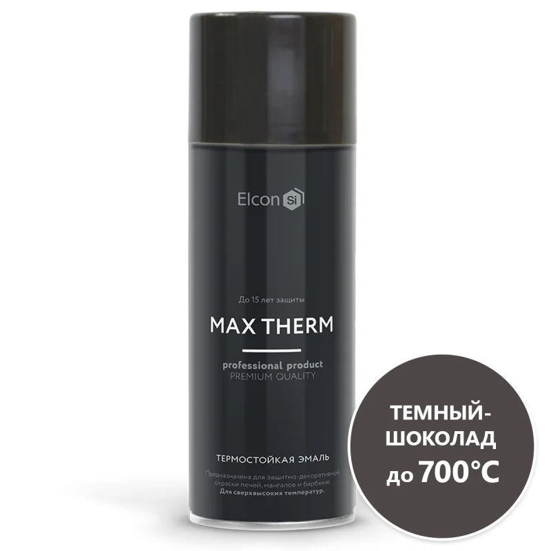 Термостойкая краска для металла, печей, мангалов, радиаторов, дымоходов, суппортов Elcon Max Therm темный шоколад, аэрозоль, 520 мл предназначена для антикоррозионной защиты металлоконструкций, оборудования, печей для саун, дымовых труб, выхлопных систем автомобилей, деталей двигателей, емкостного оборудования, подвергающихся в процессе эксплуатации воздействию температур от -60 °С до +700 °С, а также для окраски минеральных поверхностей, длительно эксплуатируемых в условиях умеренного климата.